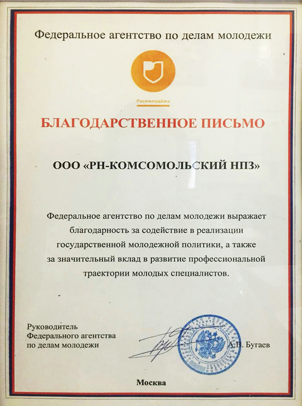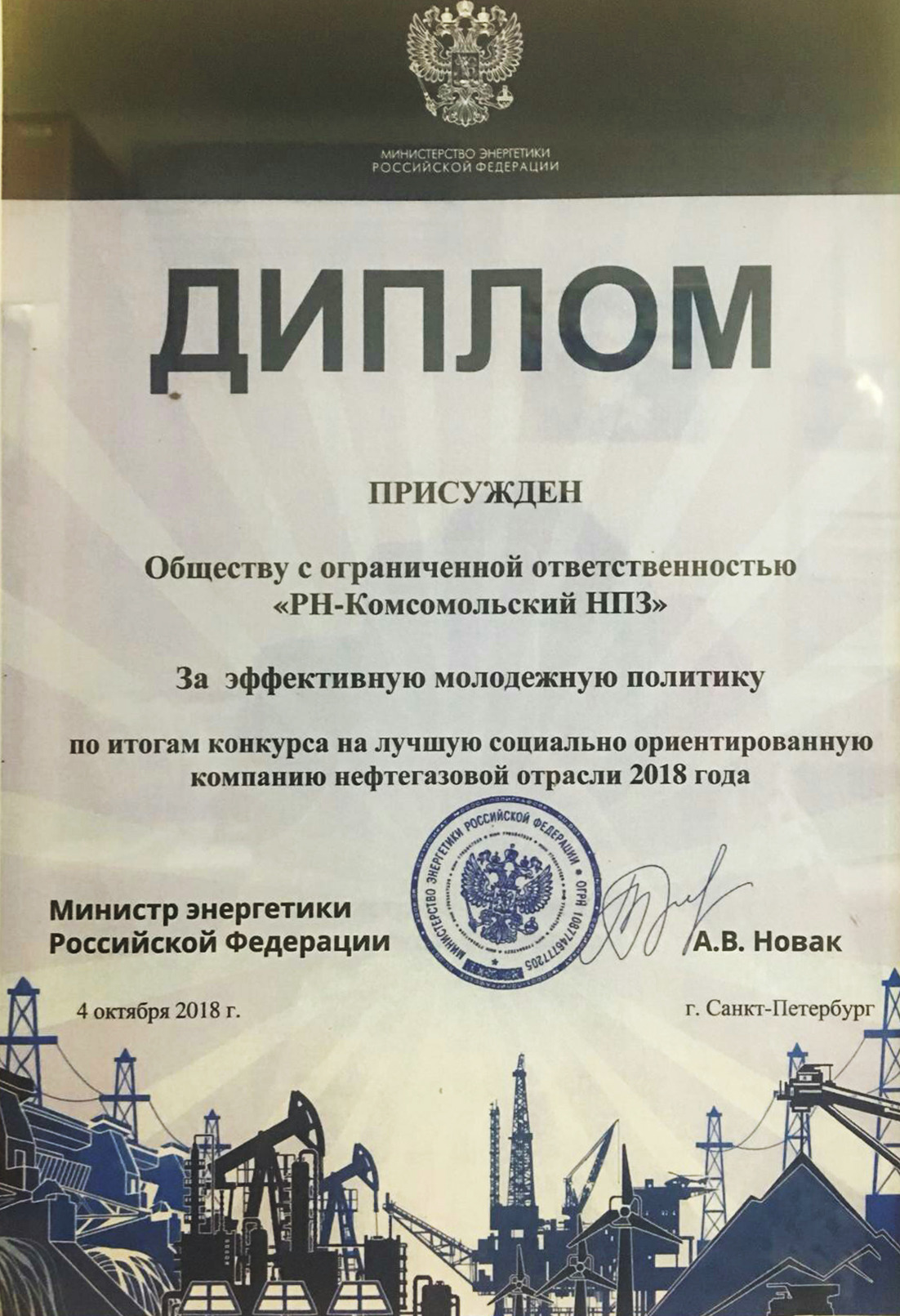 Комсомольский НПЗ получил награду за развитие молодежной политики