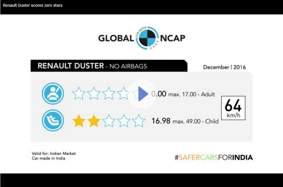 Защиту водителя в «Дастере» с опциональной подушкой безопасности оценили на три звезды (уровень безопасности ребенка не изменился). Примечательно, что латиноамериканская версия модели набрала в тесте Latin NCAP два года назад на одну звезду больше. В Global NCAP объяснили это тем, что индийский кроссовер оснащается подушкой безопасности меньшего размера, которая хуже гасит энергию удара.