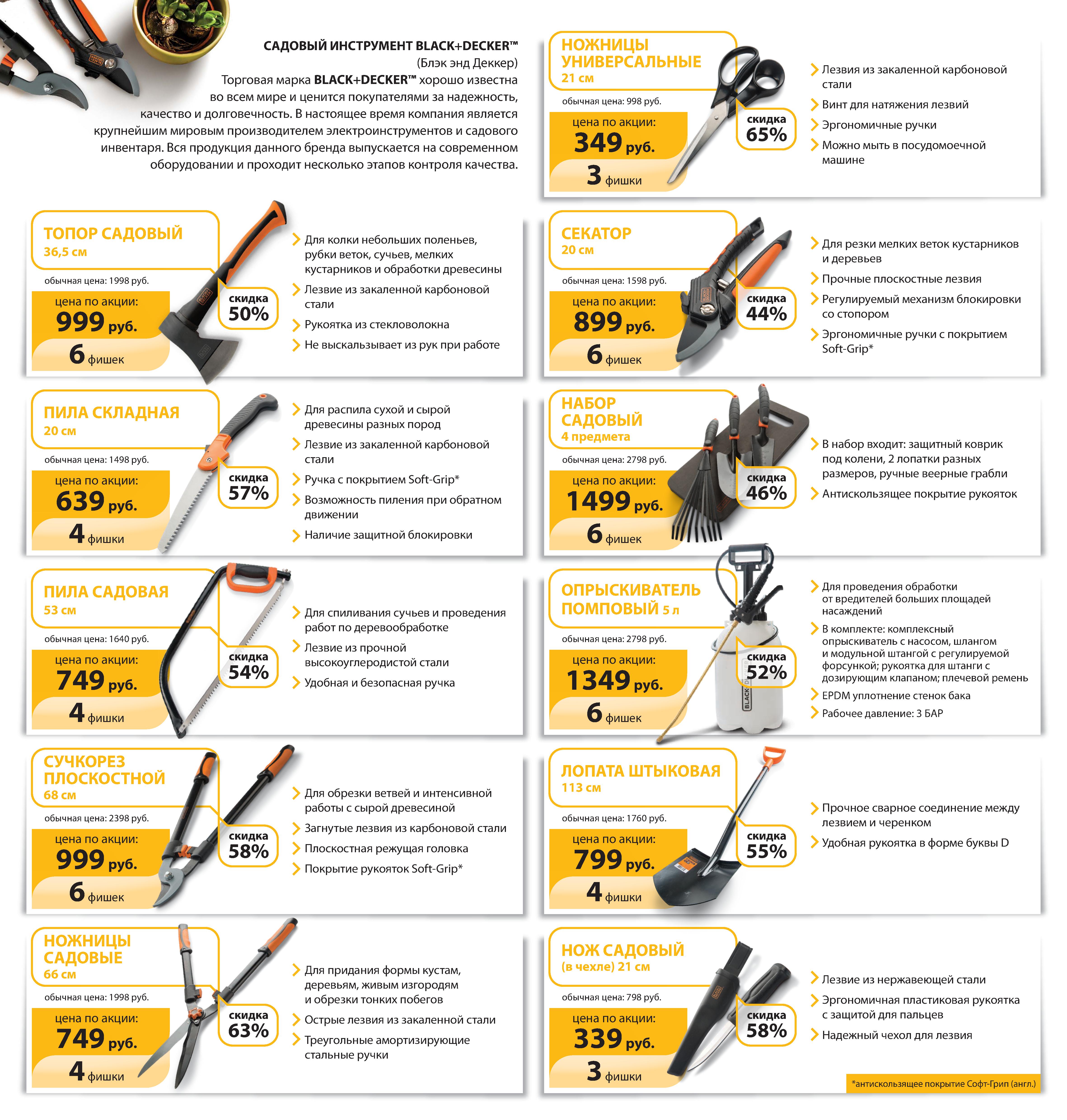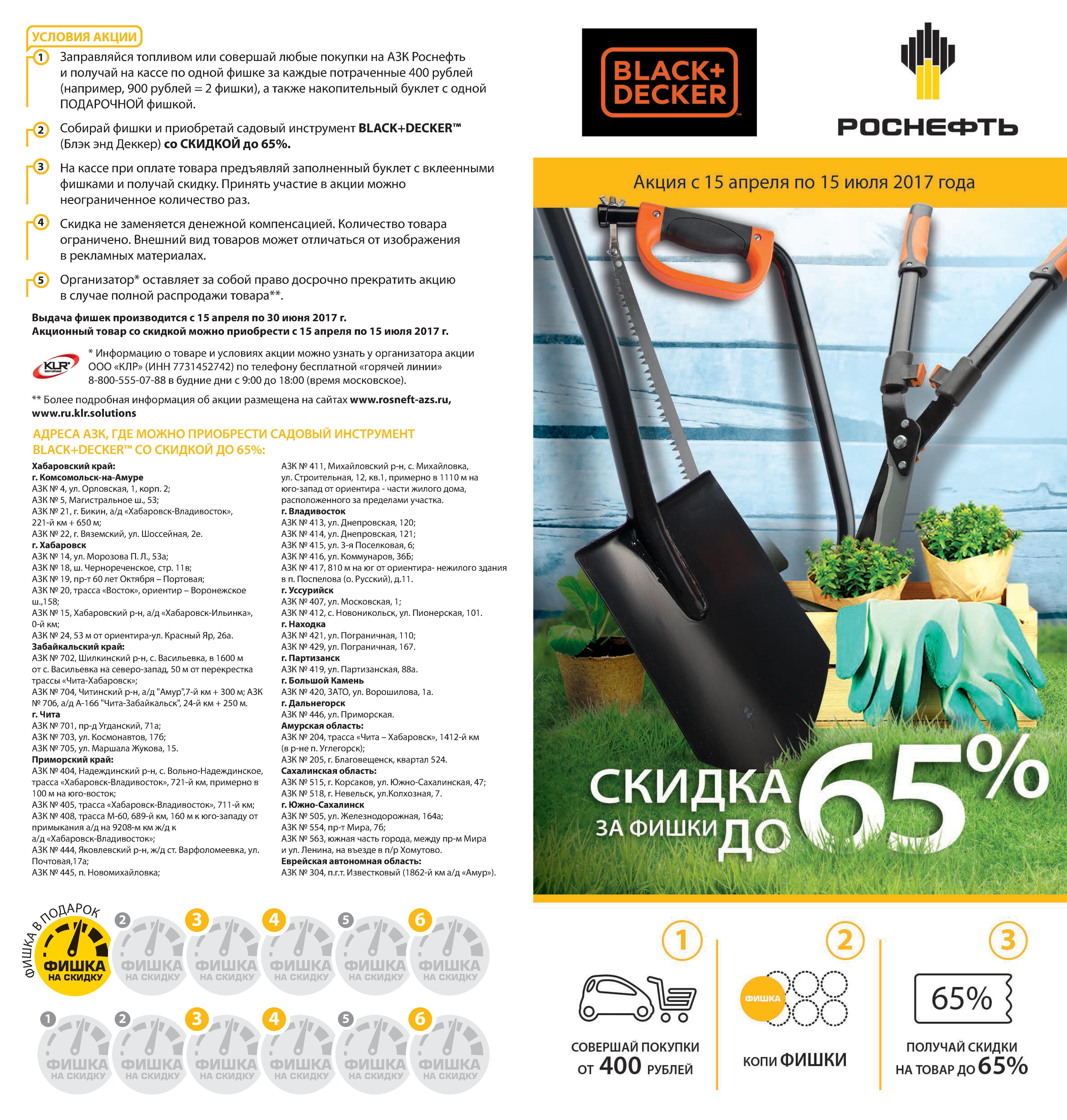 "Роснефть" объявляет акцию - заправляйся топливом или совершай любые покупки на АЗК Роснефть и получай на кассе по одной фишке за каждые потраченные 400 рублей (например, 900 рублей = 2 фишки), а также накопительный буклет с одной подарочной фишкой. Собирай фишки и приобретай садовый инструмент BLACK+DECKER™ (Блэк энд Деккер) со скидкой до 65%.