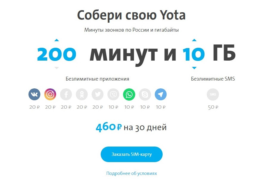 Например, можно выбрать пакет из 200 минут, 10 Гб трафика, безлимитные Instagram, ВКонтакте, WhatsApp и Telegram за 460 рублей в месяц.
