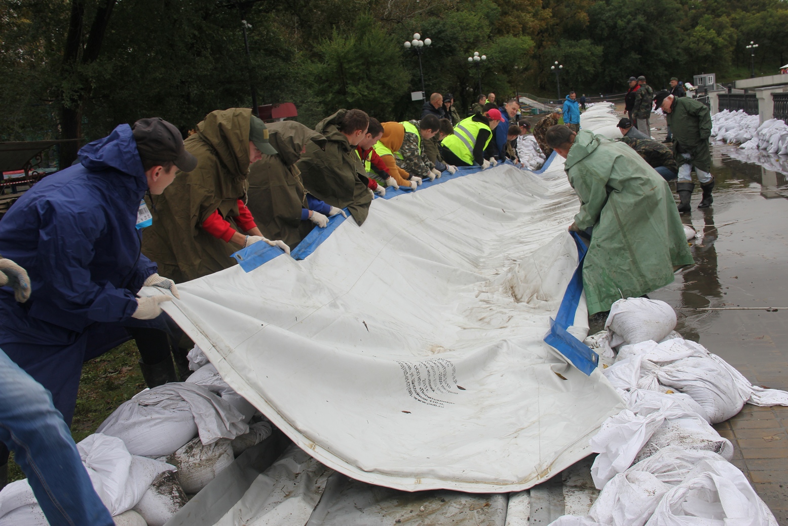 В Хабаровске сотрудники краевых пожарных и спасательных подразделений совместно с волонтерами краевого отделения всероссийской общественной организации «Школа Безопасности» провели укрепление возведённой на набережной стадиона им. Ленина водоналивной дамбы.