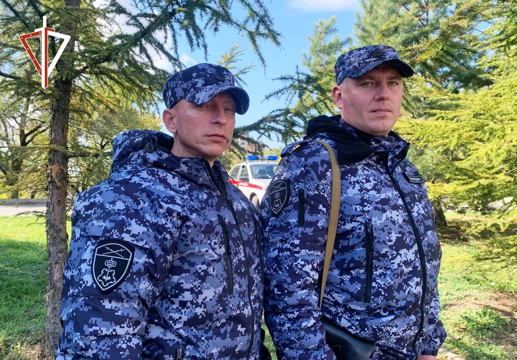 Сотрудники Росгвардии в считанные минуты добежали до указанного места и обнаружили охваченного пламенем мужчину, сидящего на газоне. Прапорщики полиции Виталий Диц и Владислав Воеводин (на снимке) при помощи форменного обмундирования сбили пламя с пострадавшего.