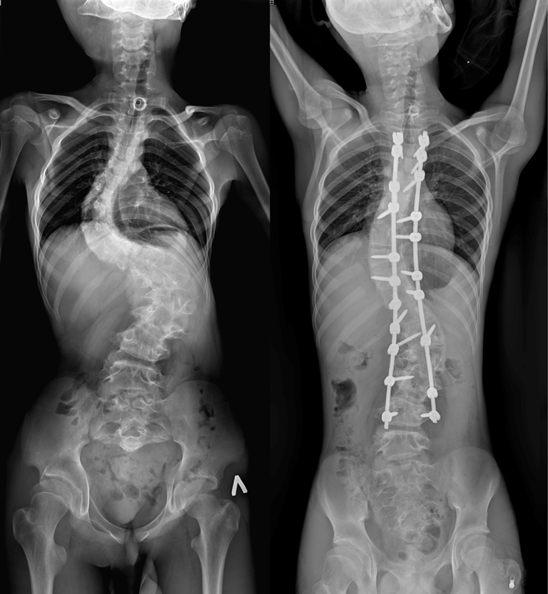 Сложности заключались в деталях: степень деформации была тяжелой, из-за выраженных гипертрофических изменений позвонков хирургам пришлось прибегнуть к обширной остеотомии задней колонны — селективной резекции костных структур: суставов, дужек, остистых отростков позвонков. Это позволило добиться адекватной мобилизации позвоночника в области искривления. Также была проведена торакопластика, резекция трех ребер с целью достижения удовлетворительной деротации на вершине грудной клетки и улучшения возможностей адаптации органов грудной клетки в послеоперационном периоде.