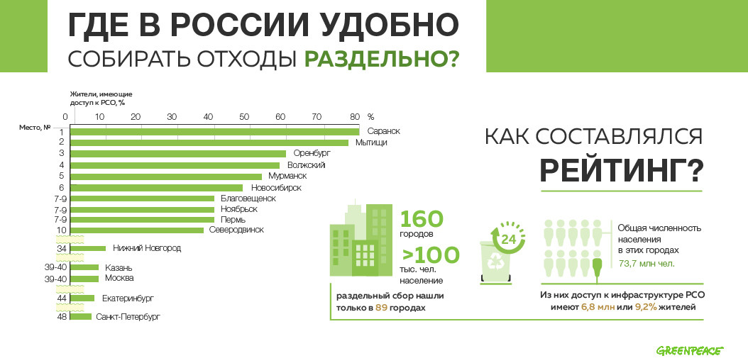 Для исследования эксперты Гринпис России определили более 160 крупных городов с населением от 100 тыс. человек — именно в них сейчас предпринимаются попытки внедрения раздельного сбора отходов. Затем в этих городах определили общее количество контейнерных площадок для сбора мусора и отдельно — число площадок, оборудованных баками для раздельного сбора. Соотношение числа жителей и стационарных мест для сбора вторсырья и стало основой рейтинга.