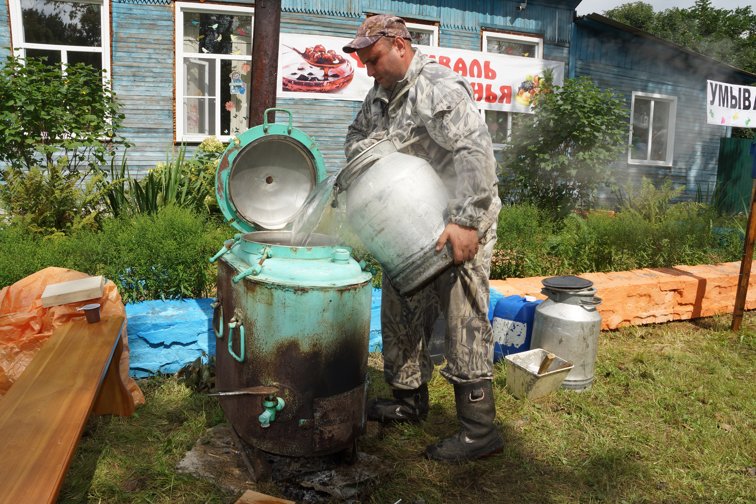 Дым из полевой кухни привлекал внимание собравшихся. В большом двухсотлитровом «самоваре» варился экологически чистый чай на ключевой воде. Поблизости волонтеры бесплатно разливали ароматный напиток в пластиковые стаканчики.