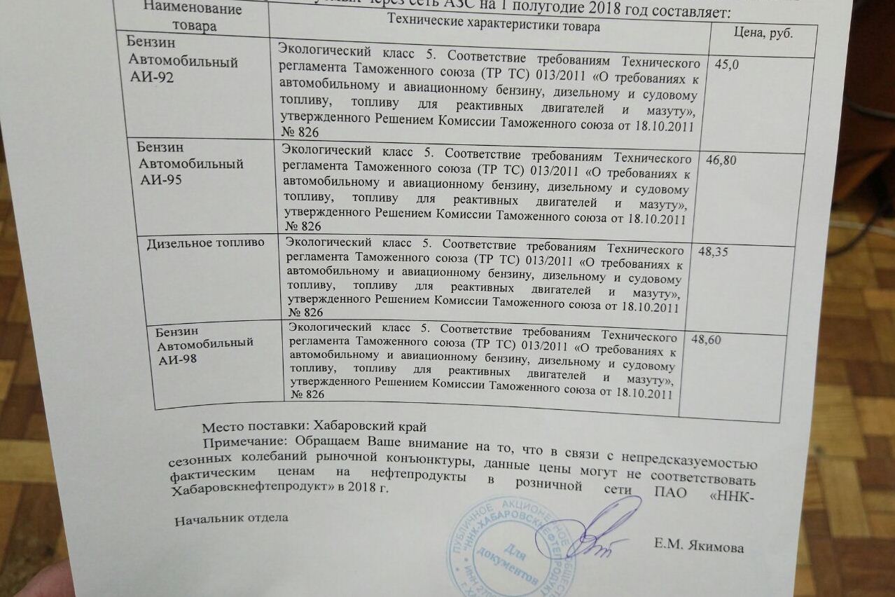 Хабаровские аккаунты в социальных сетях и каналы в популярных мессенджерах наводнили сообщения о якобы повышении в сети "ННК" стоимости топлива до 47-48 рублей за литр с нынешних 40-41 рубля, сообщает корр. РИА АмурПРЕСС. Так, по сообщениям популярных пабликов в Instagram, разместивших документ за подписью некой Е.М. Якимовой, "ННК" прогнозирует рост стоимости своего бензина в рознице в первом полугодии 2018 года в среднем на 10 %.